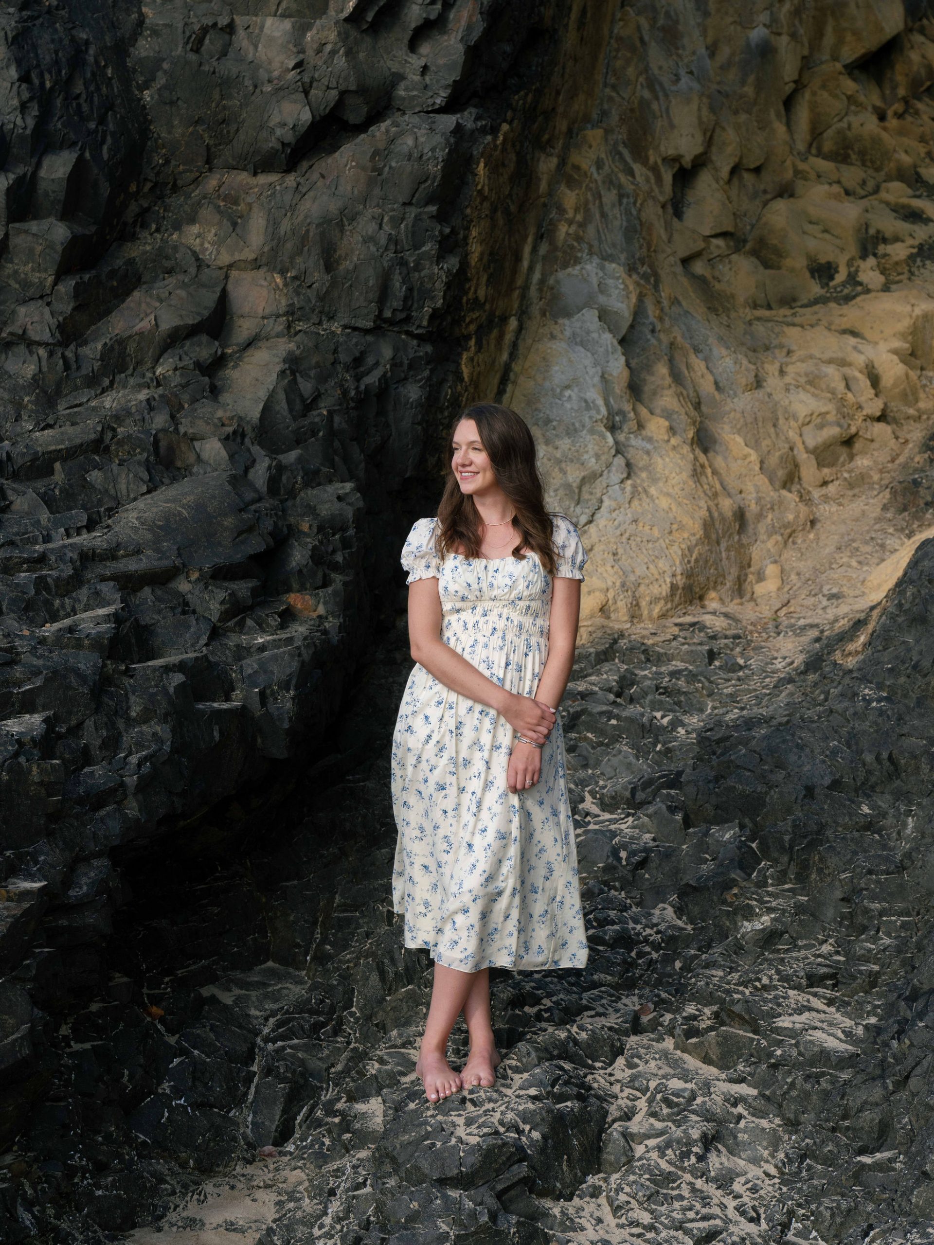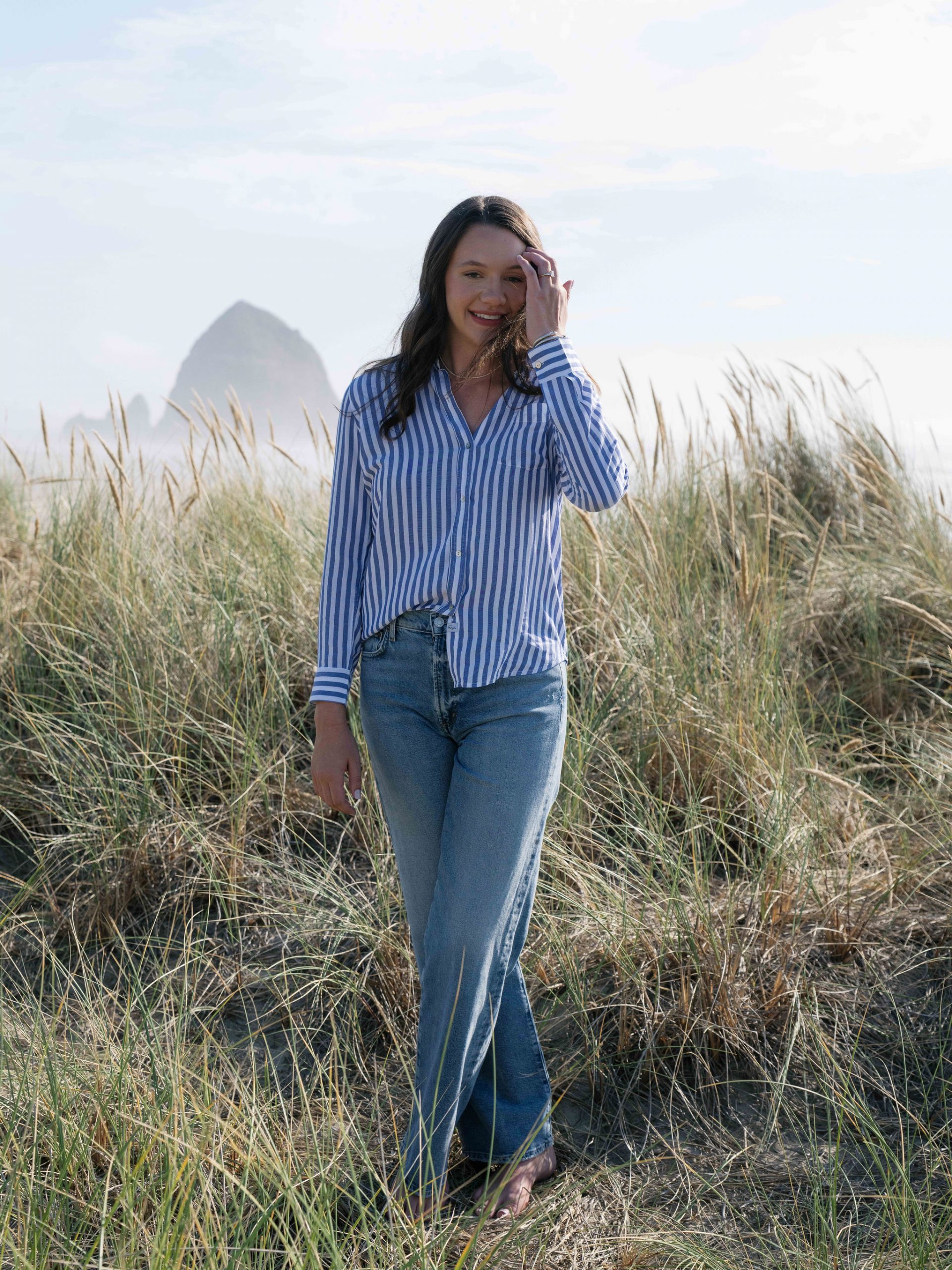 We began the afternoon tucked into the grassy dunes near Cannon Beach. The light was soft and golden, filtering through the tall beachgrass, while Claire’s flowing dress caught the breeze perfectly. These moments set the tone — quiet, intimate, and full of natural movement.