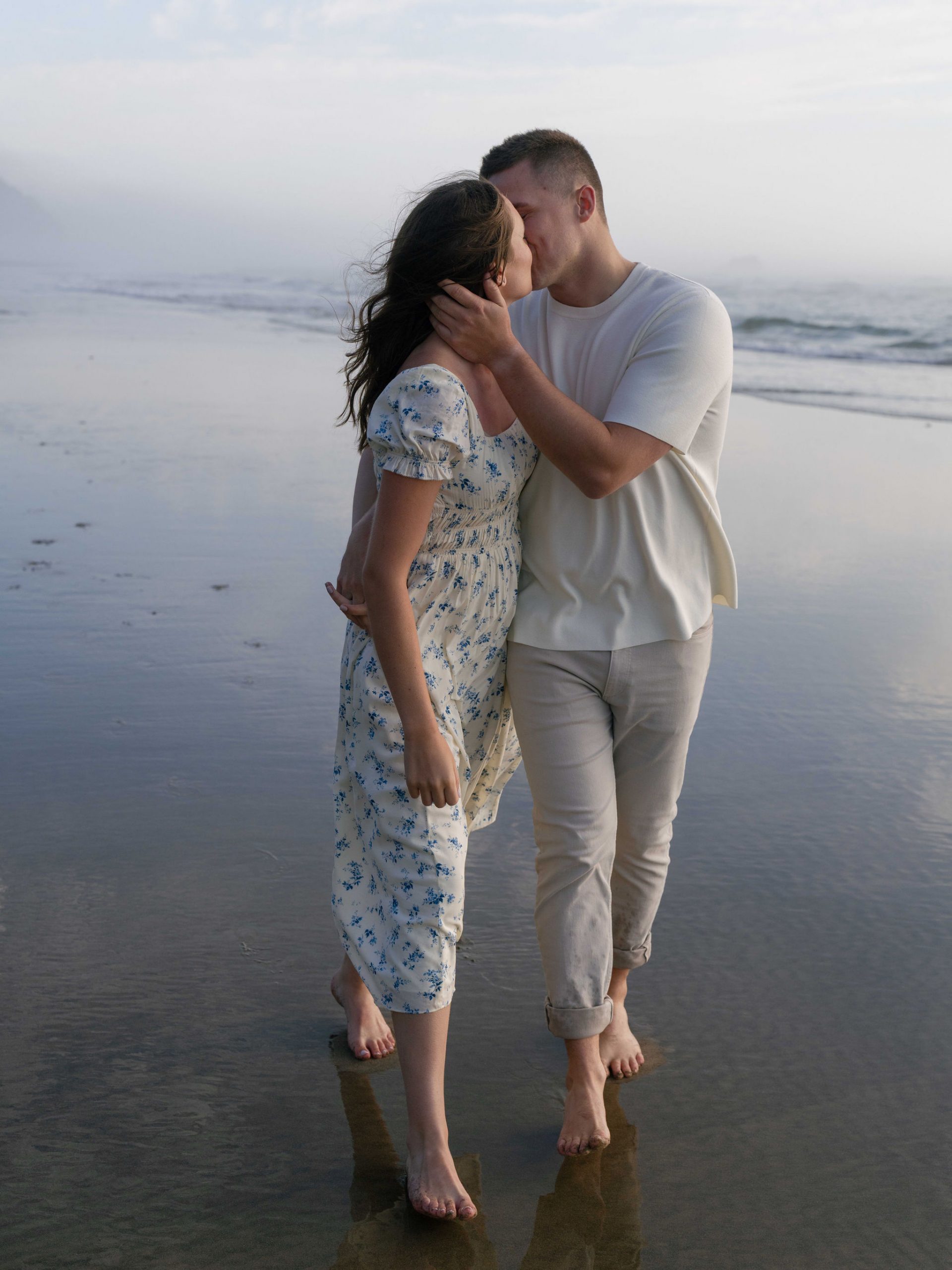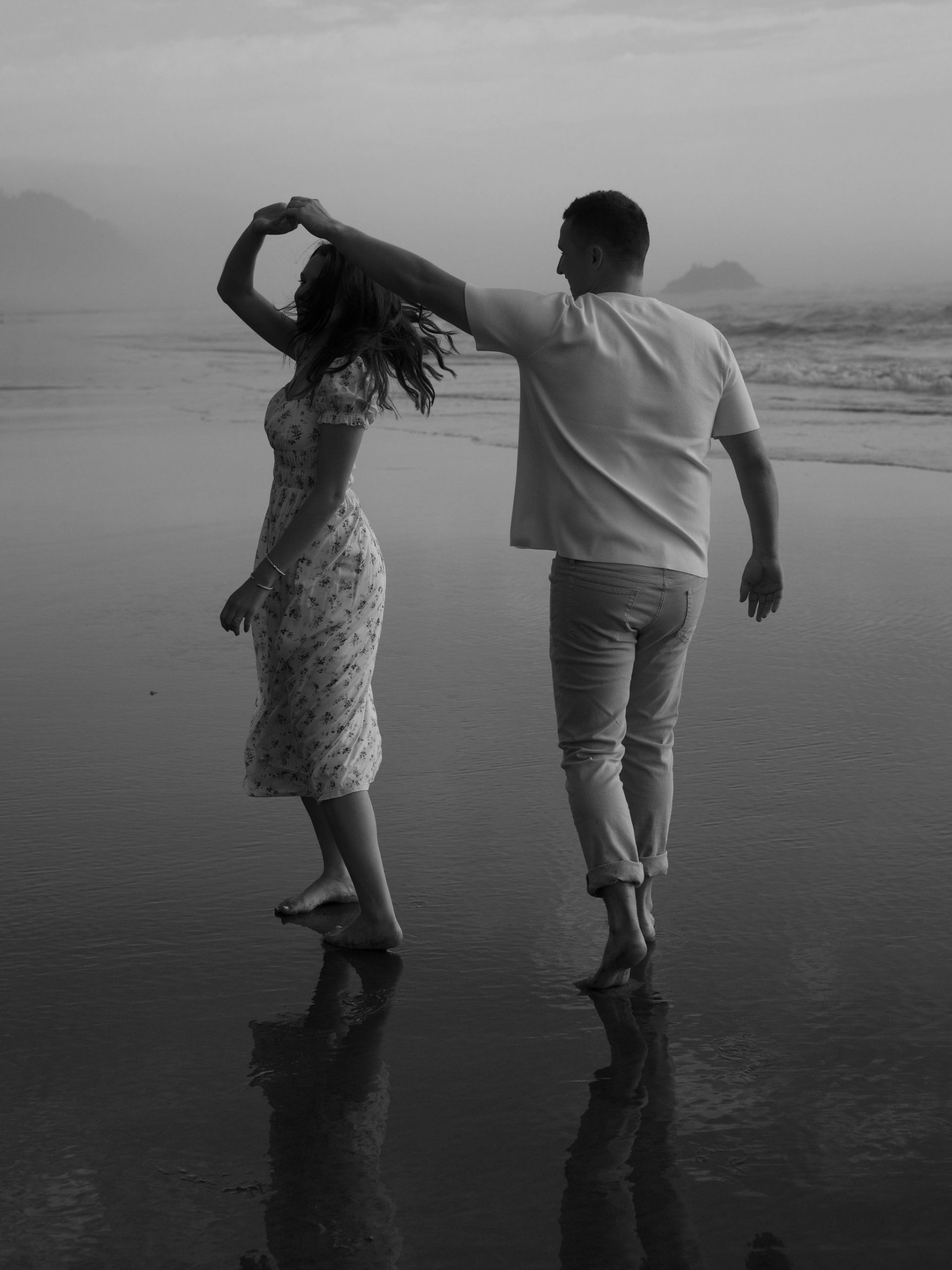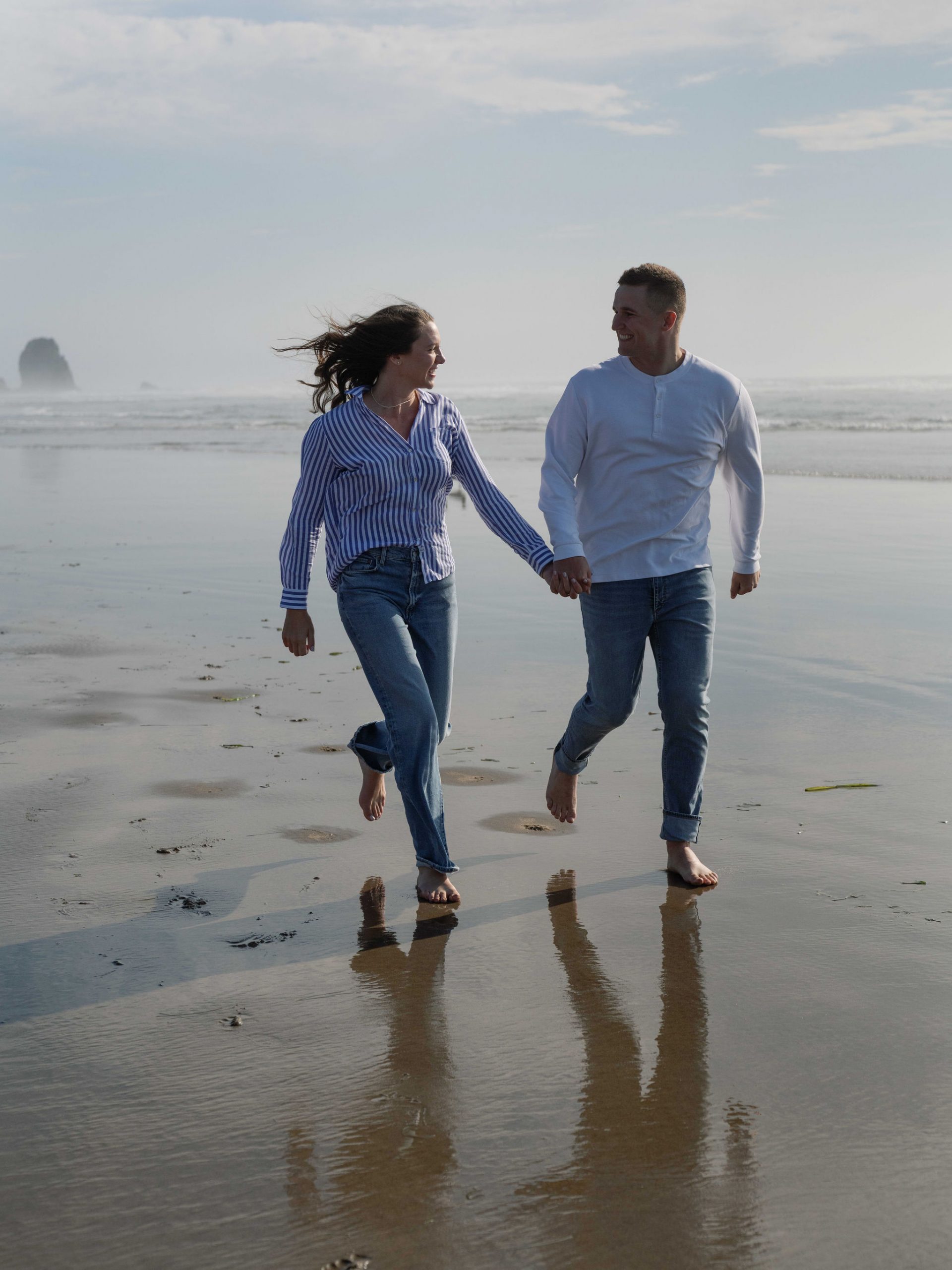 From there, we made our way down to the shoreline. Cannon Beach opened wide before us, its wet sand reflecting the sky like glass. Claire and Ryan ran barefoot along the water’s edge, laughing as the tide curled around their feet. The backdrop of Haystack Rock gave every frame a sense of place, reminding us why Cannon Beach is such a beloved spot for engagement photos.