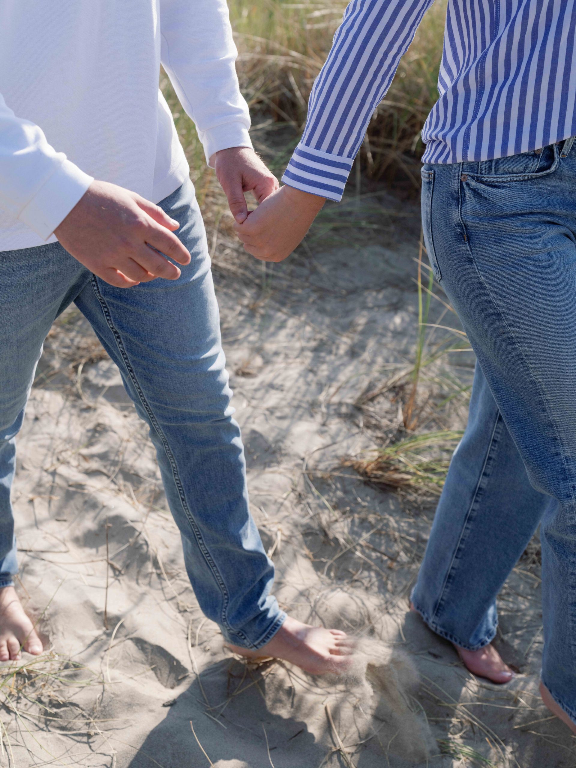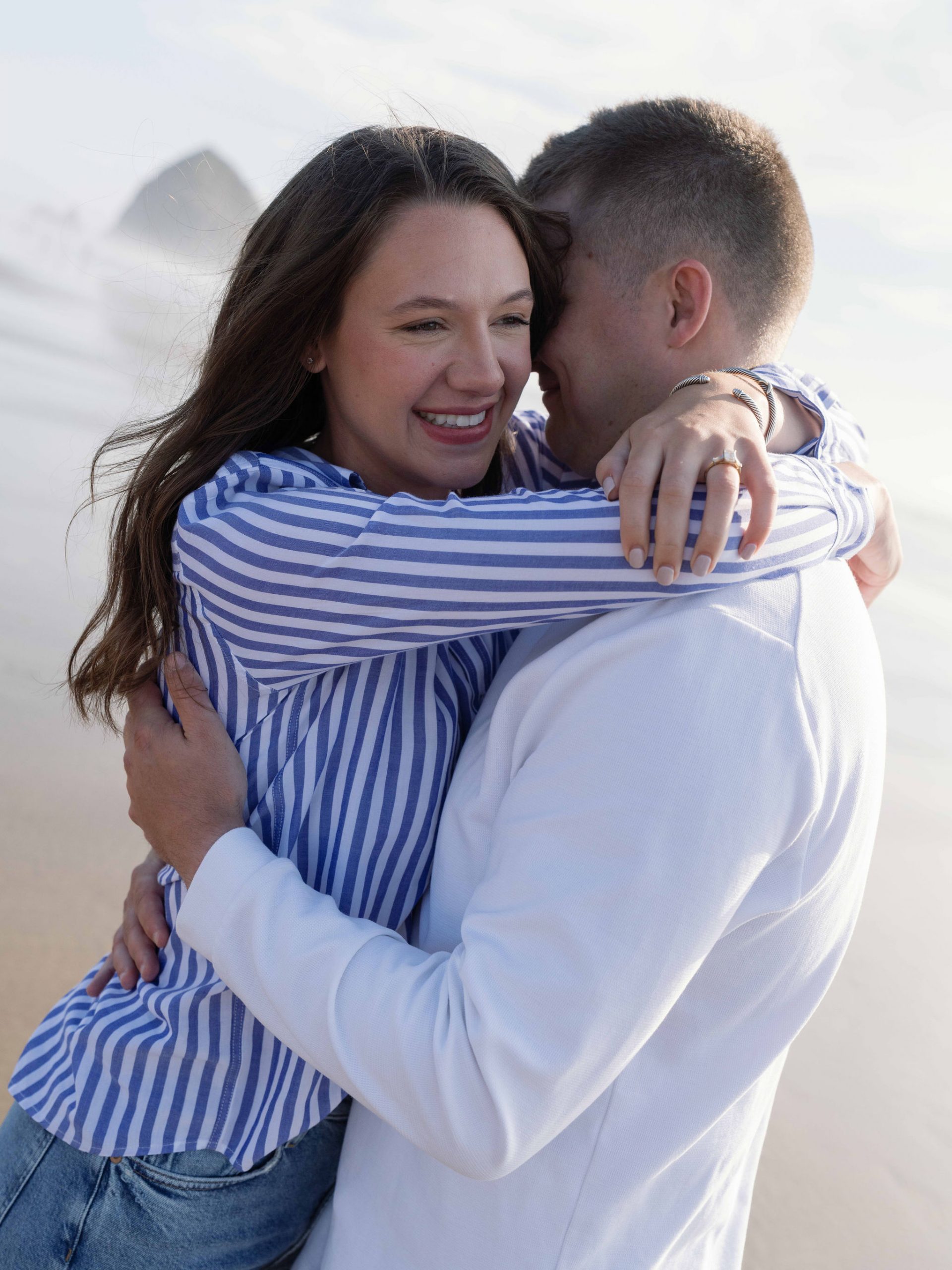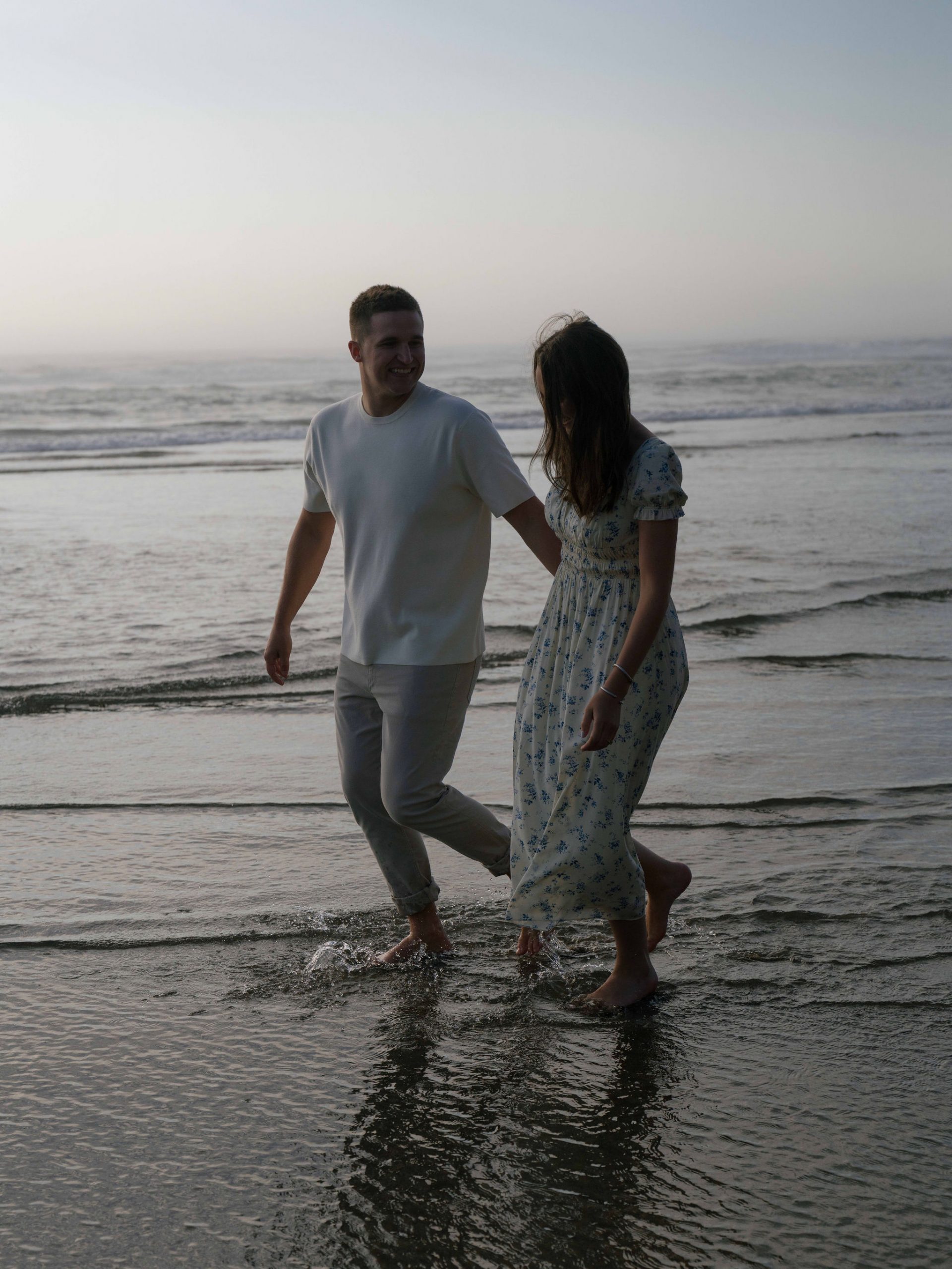 From there, we made our way down to the shoreline. Cannon Beach opened wide before us, its wet sand reflecting the sky like glass. Claire and Ryan ran barefoot along the water’s edge, laughing as the tide curled around their feet. The backdrop of Haystack Rock gave every frame a sense of place, reminding us why Cannon Beach is such a beloved spot for engagement photos.