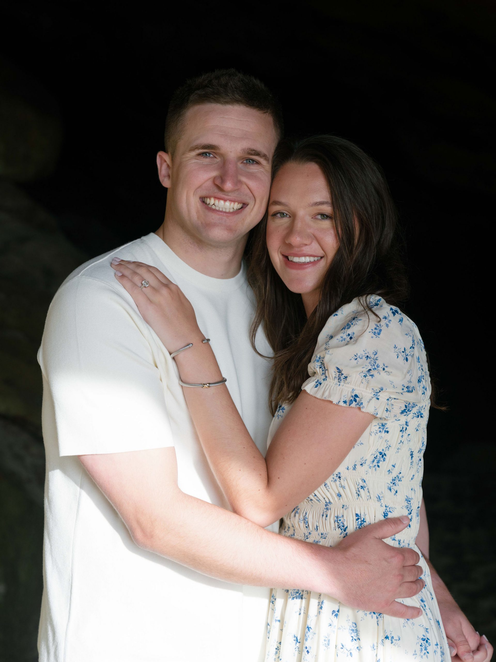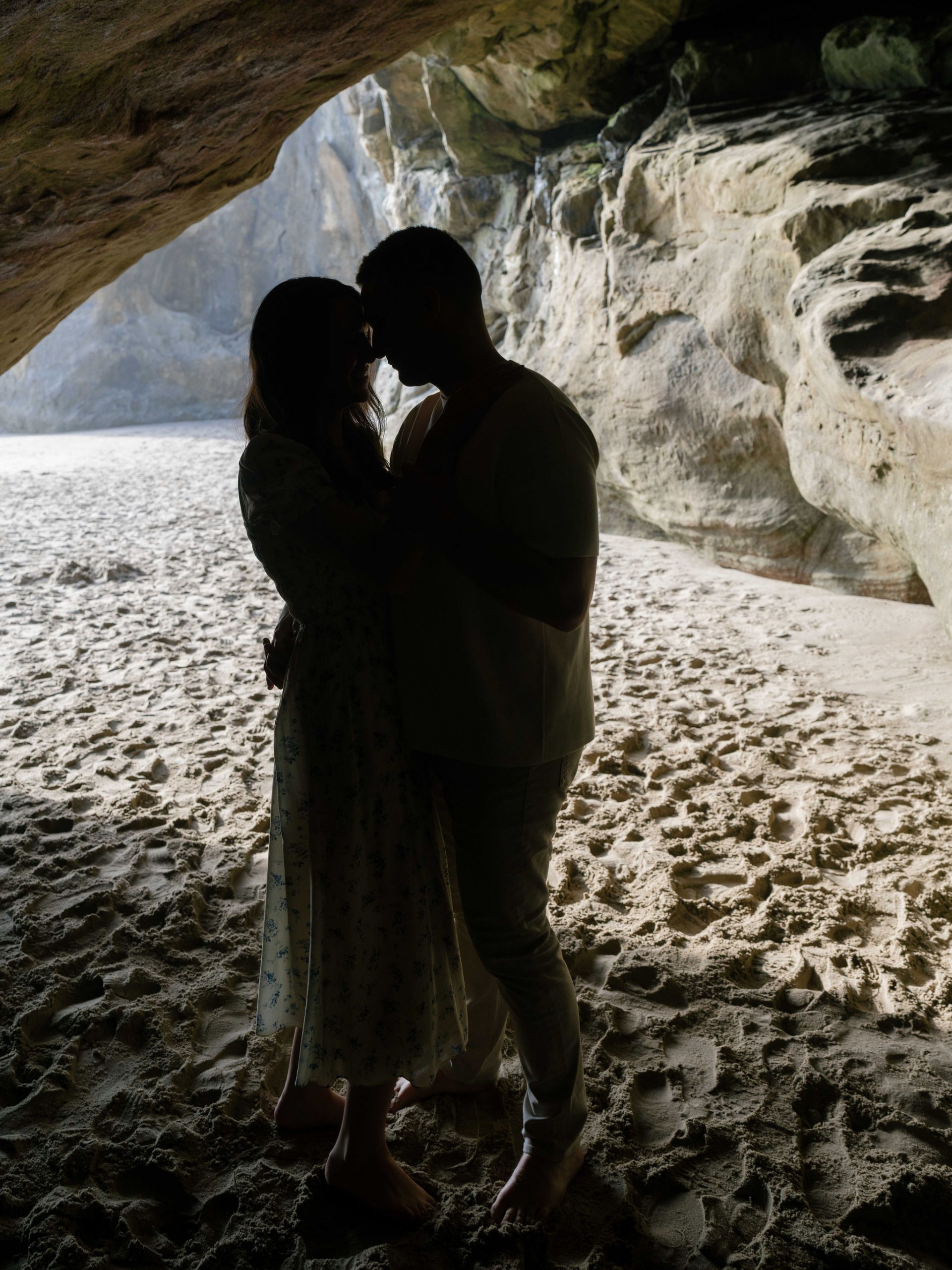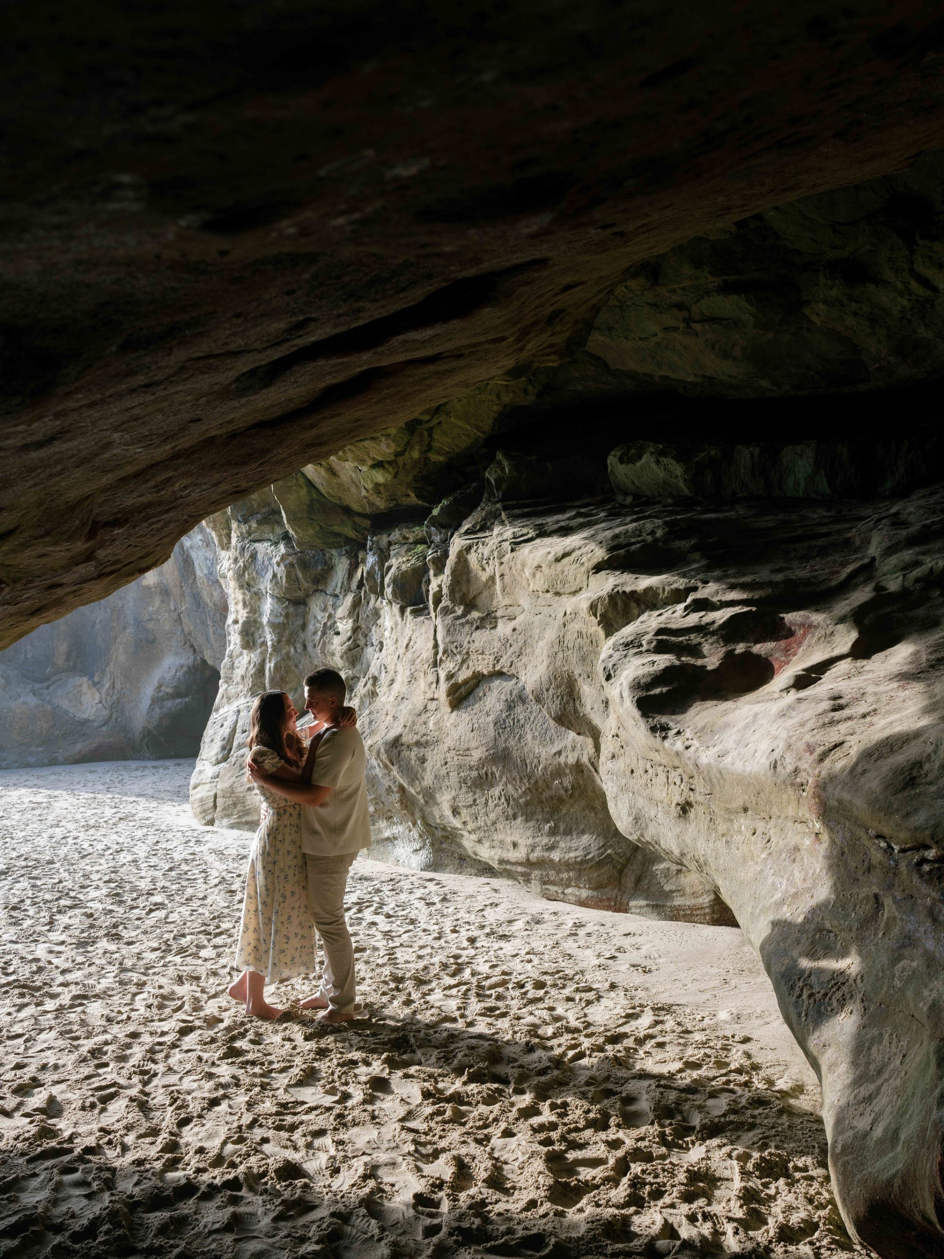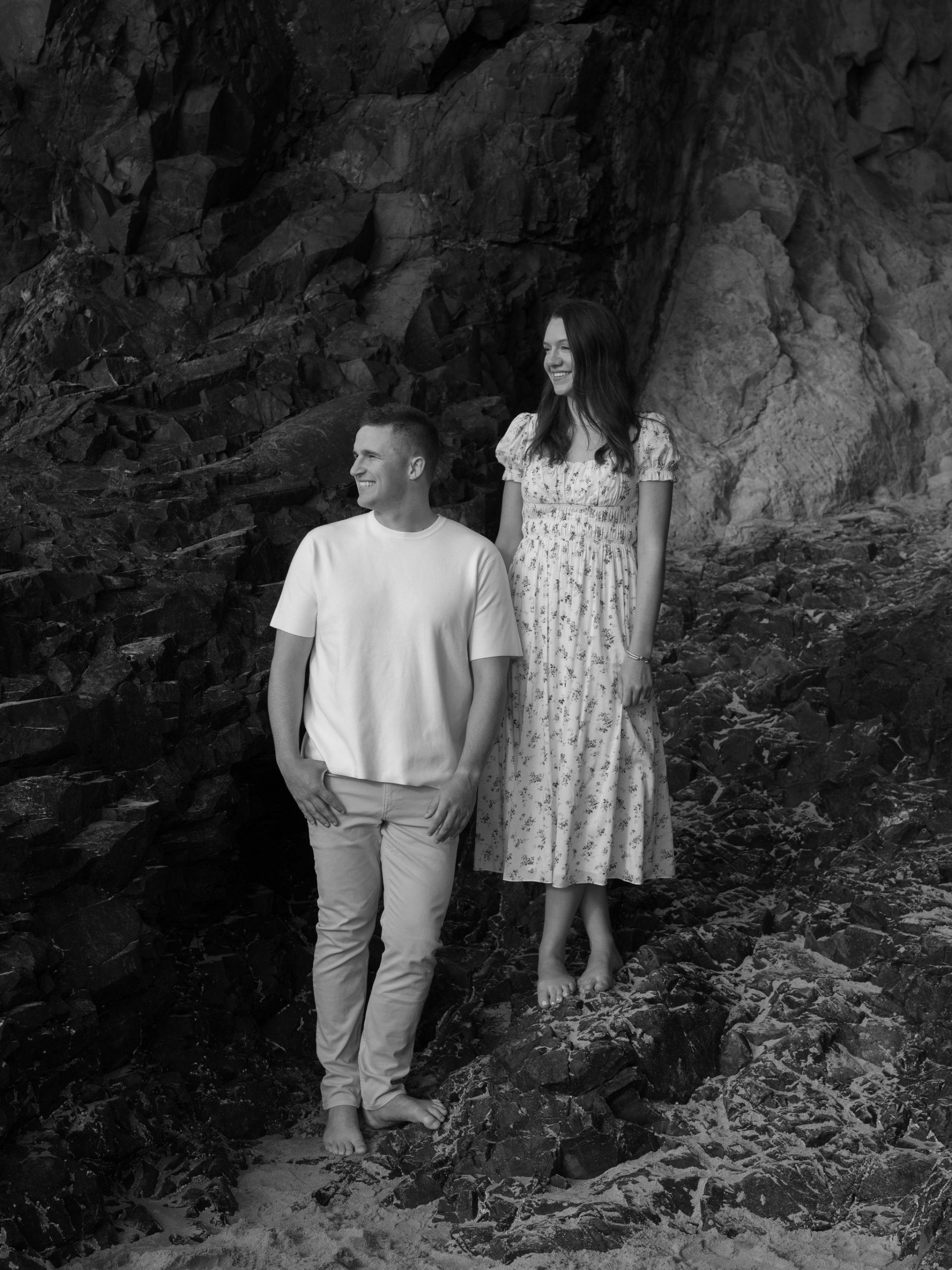 Next, we explored Hug Point, one of the Oregon Coast’s most unique locations. With its rugged cliffs, waterfall, and textured rock formations, it added a touch of adventure to the session. Claire and Ryan embraced against the stone backdrop, their laughter echoing as waves rushed in around them. Hug Point always feels like a secret corner of the coast — wild, romantic, and a little dramatic.