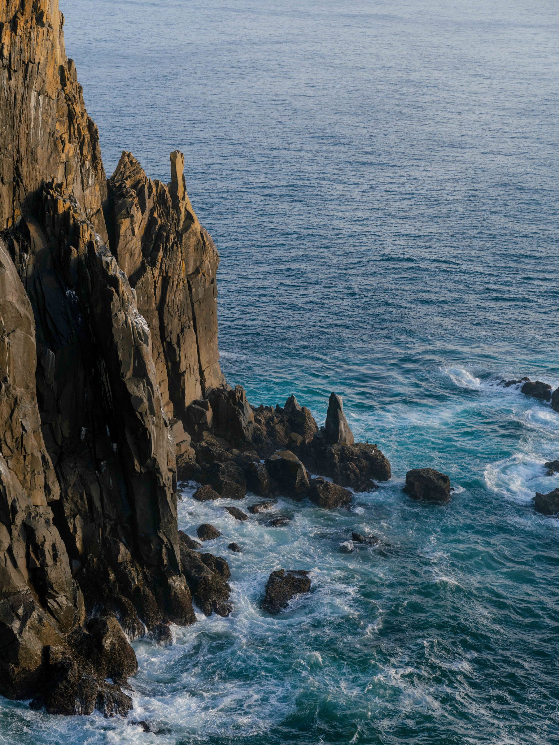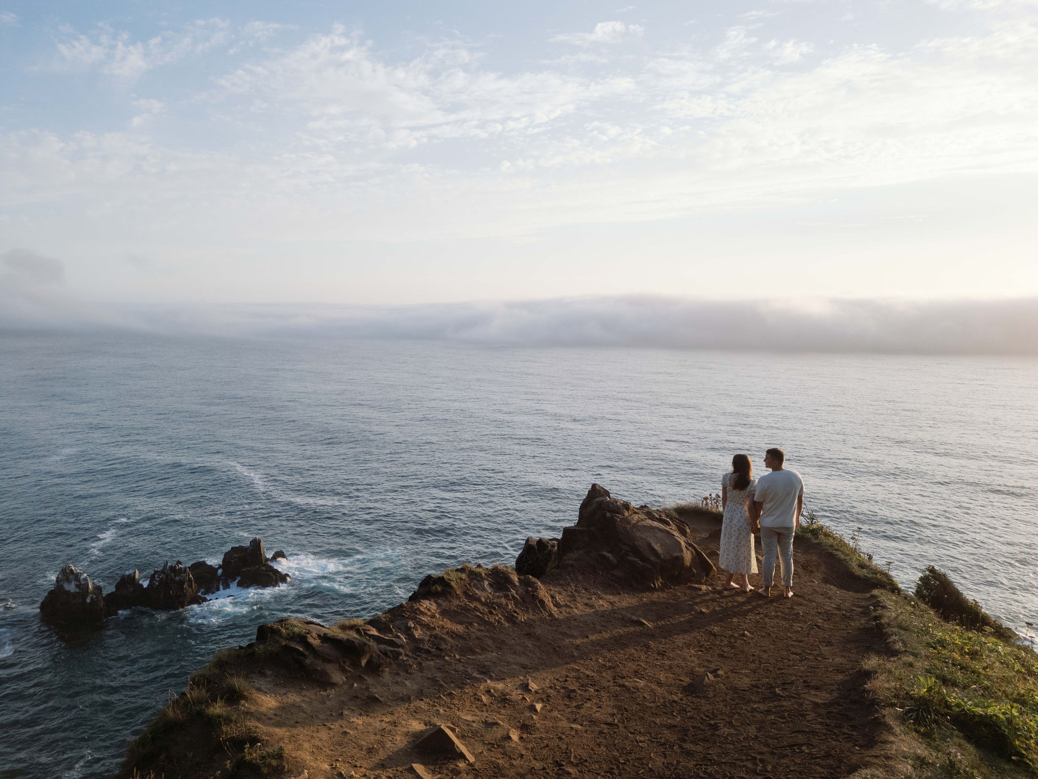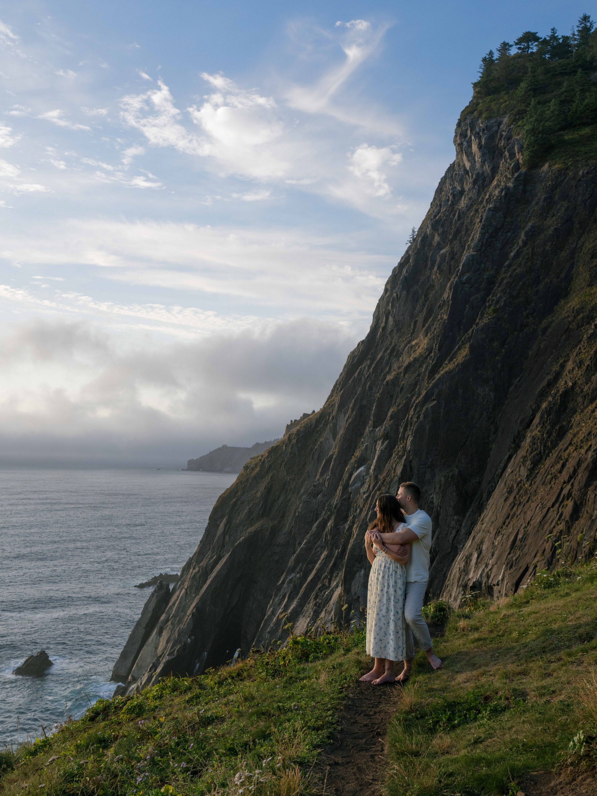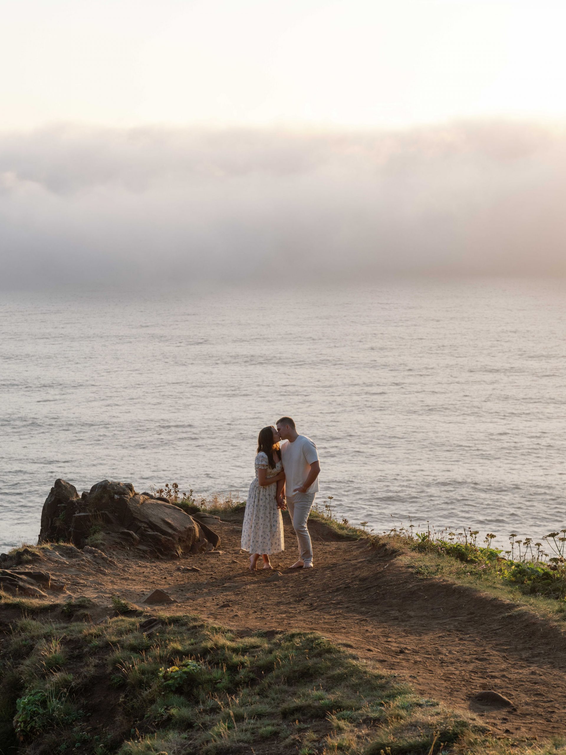 To end the session, we drove to one of my favorite overlooks for panoramic ocean views. Here, the Pacific Northwest shows its full power: cliffs dropping into the sea, waves crashing far below, and the horizon lit with fiery sunset color. Standing together against the vastness, Claire and Ryan looked both small and infinite — the perfect way to close their engagement story.